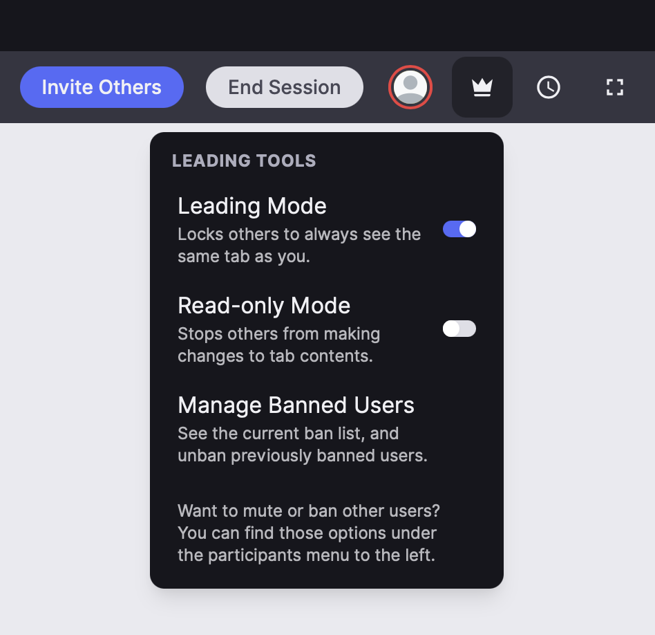 Often, when teaching younger children or performing a presentation, it's useful to have the option to control what the other person can or can't do. That's where Leading Mode comes in. Users who are identified as Leaders will be able to switch Leading Mode on, which forces all non-leader participants to follow the leader's view as they move around a space.